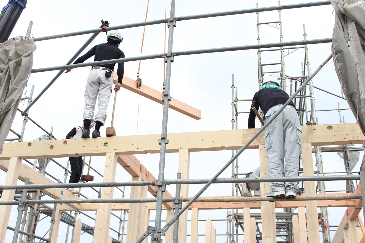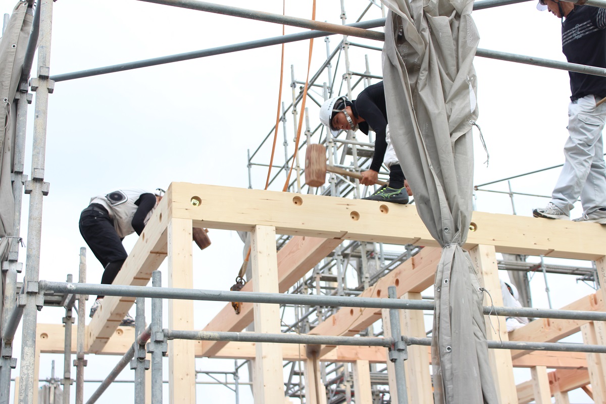 いつもの仲良しの大工メンバーなので、息の合った作業で、効率よく柱・梁が組みあがっていきます。