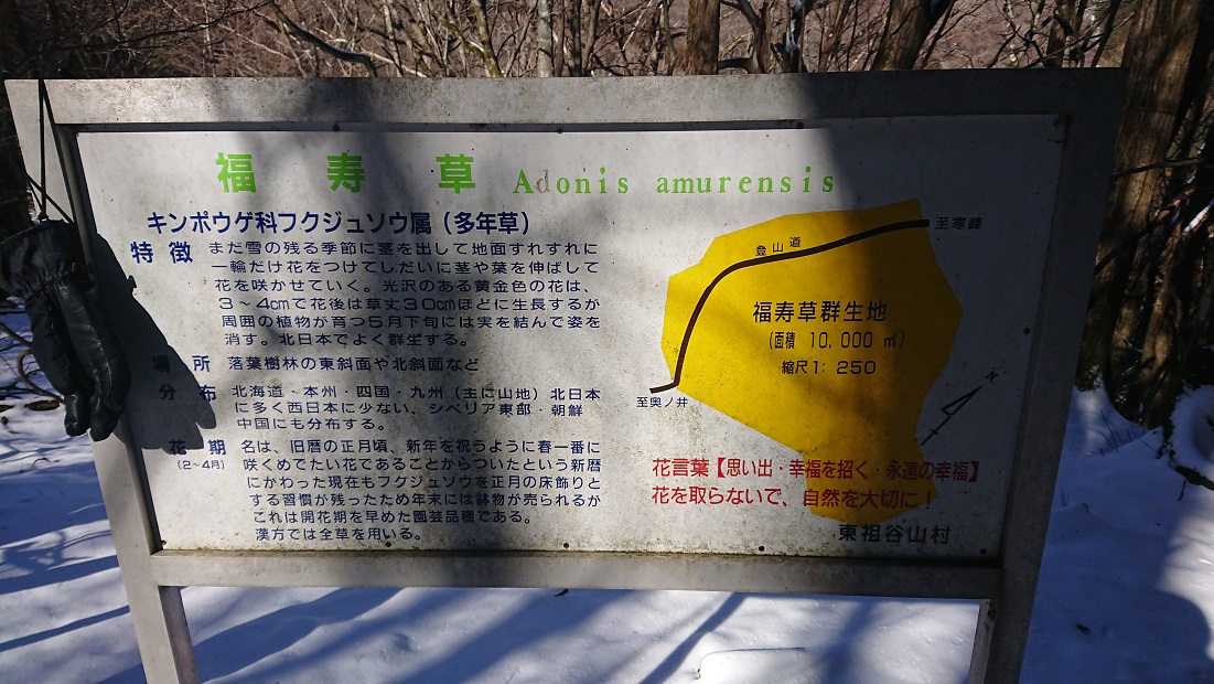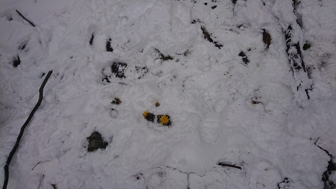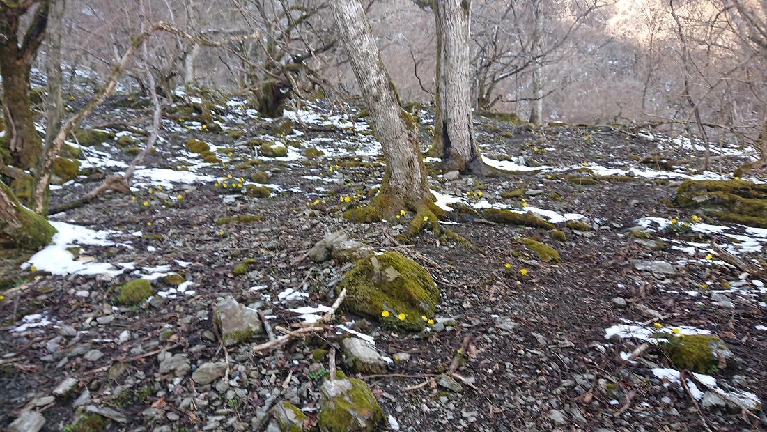 お昼を食べて下山する頃には雪もある程度とけて福寿草がはっきり群生しています