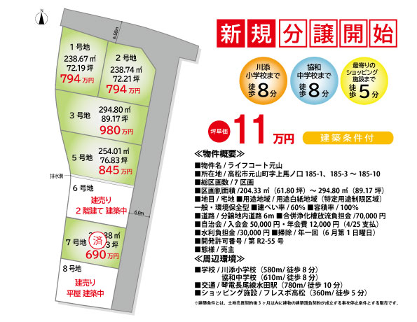 - ◆販売区画数:7区画◆価格帯6,900,000円~9,800,000円◆土地面積:204.33㎡~294.80㎡◆排水・浄化槽:合併浄化槽負担金70,000円・水利負担金30,000円◆掃除:年1回(6月第一日曜日)◆自治会費:12,000円/年・入会金50,000円◆開発許可番号:第R2-55号(R2.7.31)